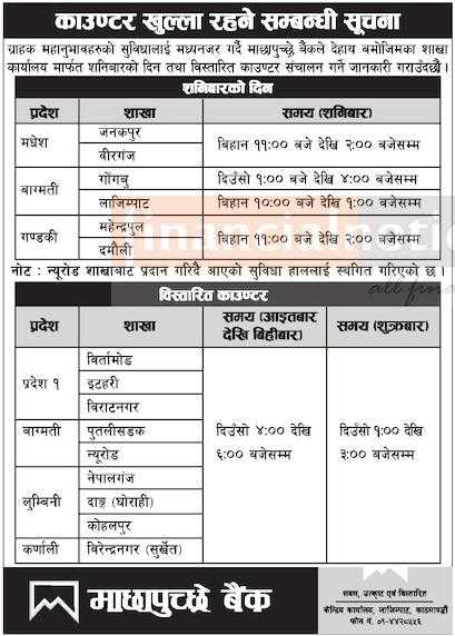माछापुच्छ्रे बैंकको विभिन बारका दिन निम्न शाखा तथा काउण्टरहरु खुल्ला रहने सम्बन्धी सूचना