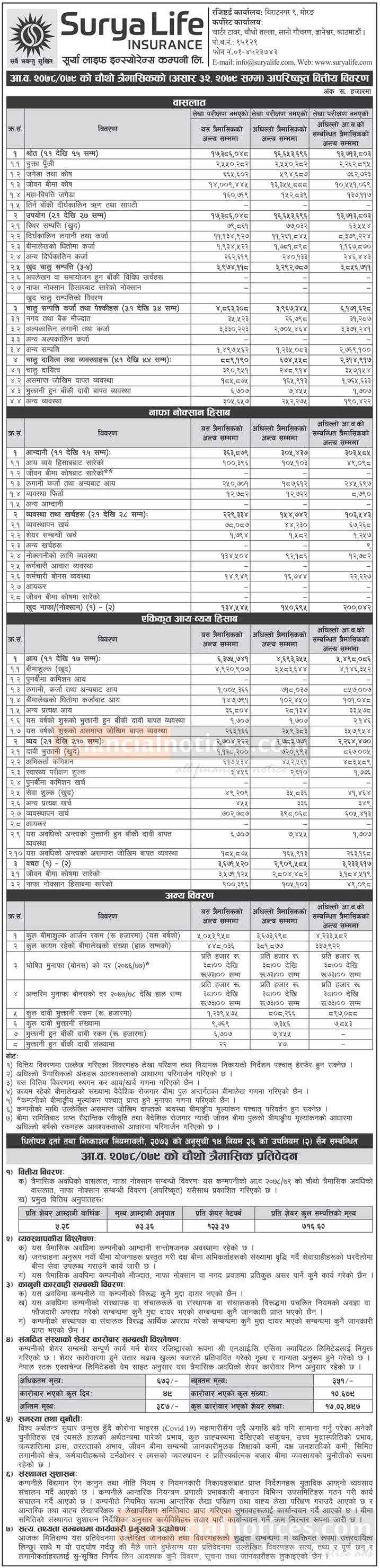 सूर्या लाईफ इन्स्योरेन्सको खुद नाफा १३ करोड ४५ लाख रुपैयाँ