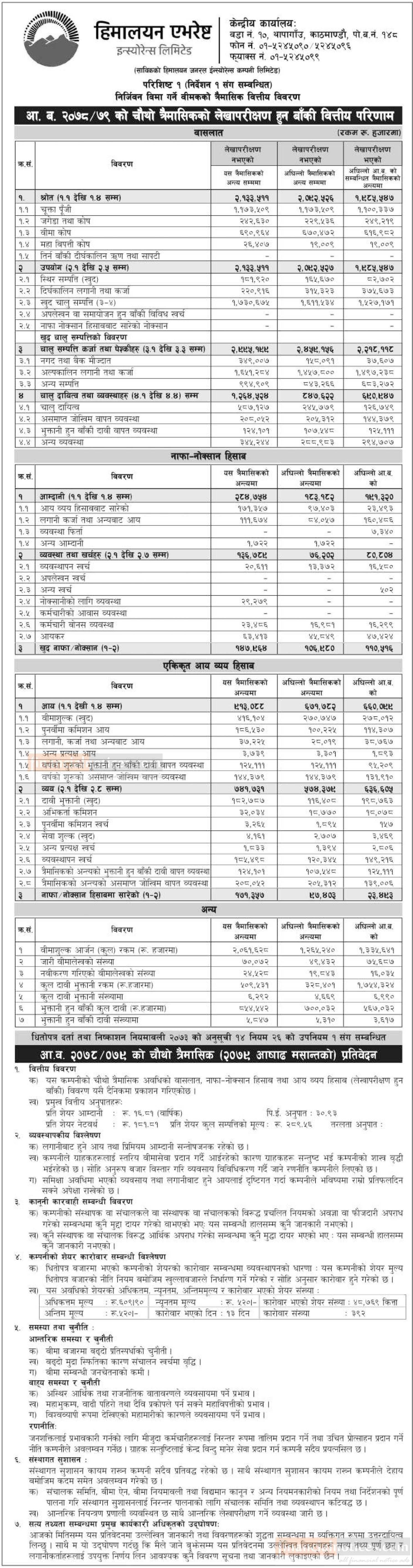Himalayan Everest Insurance has posted a net profit of Rs 70.55 million during the 4th quarter.