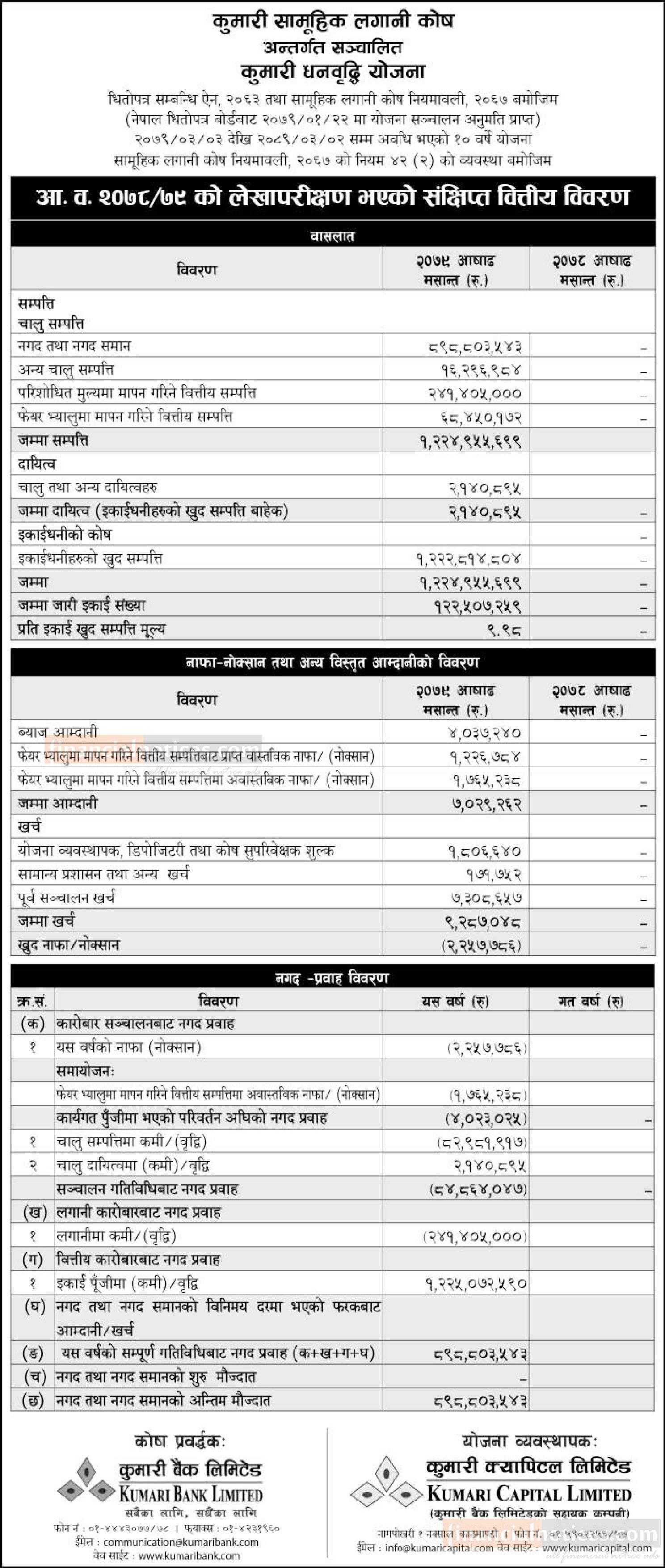 Kumari Capital has published the audited financial highlights of Kumari Dhanabriddhi Yojana.