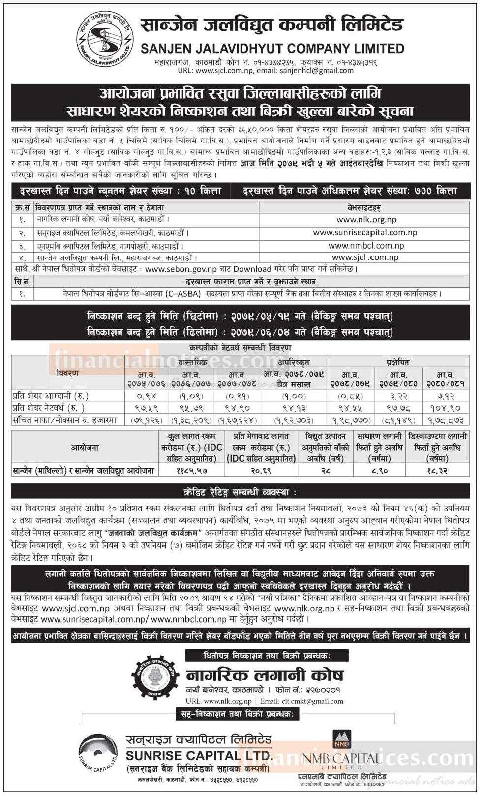 सान्जेन जलविद्युतको आईपीओमा आजदेखि आवेदन दिन सकिनेबारे सूचना