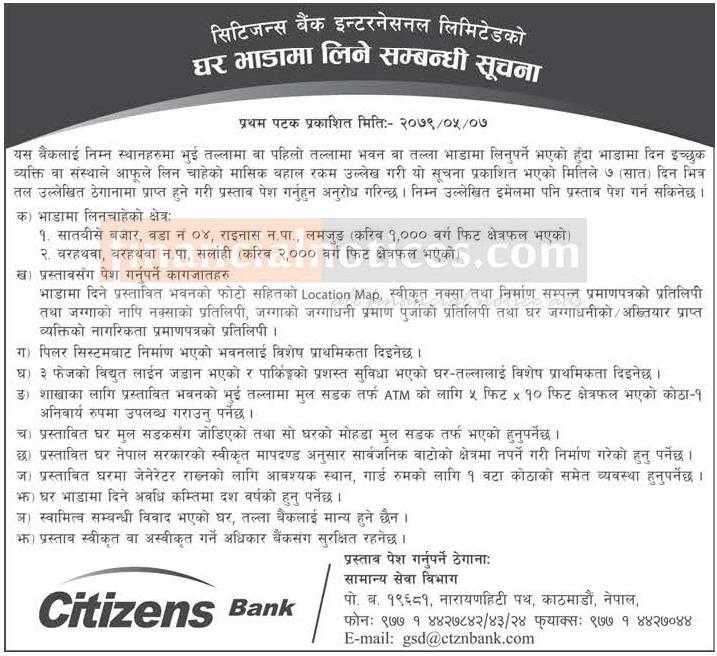 सिटिजन्स बैंकको लागि कार्यालय भवनको आवश्यकता