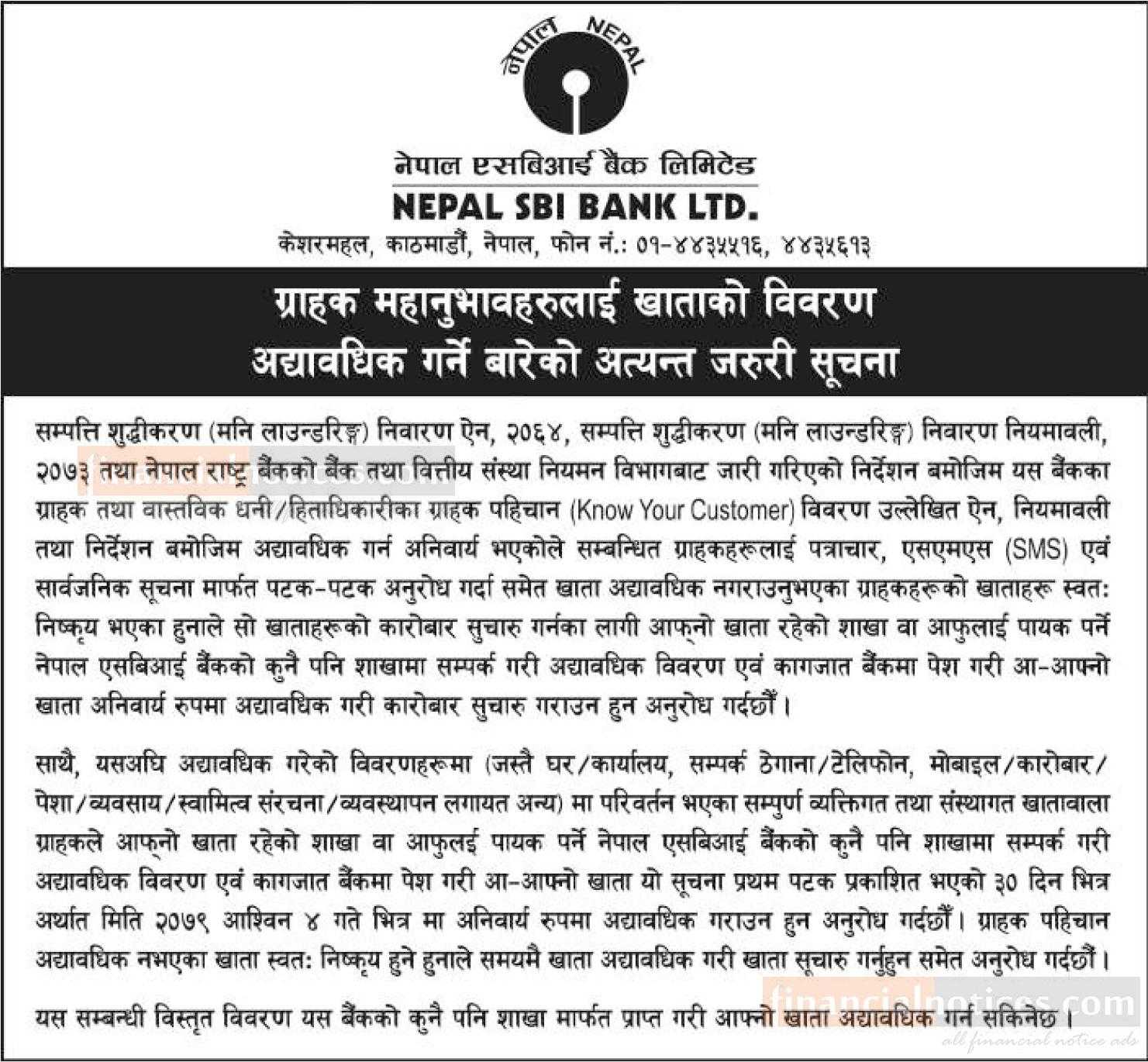 नेपाल एसबिआई बैंकका खातावालाहरुलाई खाताको विवरण अद्यावधिक गर्ने बारेको अत्यन्त जरुरी सूचना