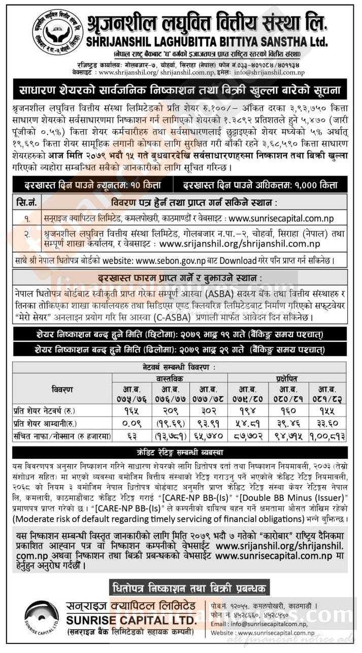 श्रृजनशील लघुवित्तको IPO बिक्री खुला सम्बन्धी सूचना