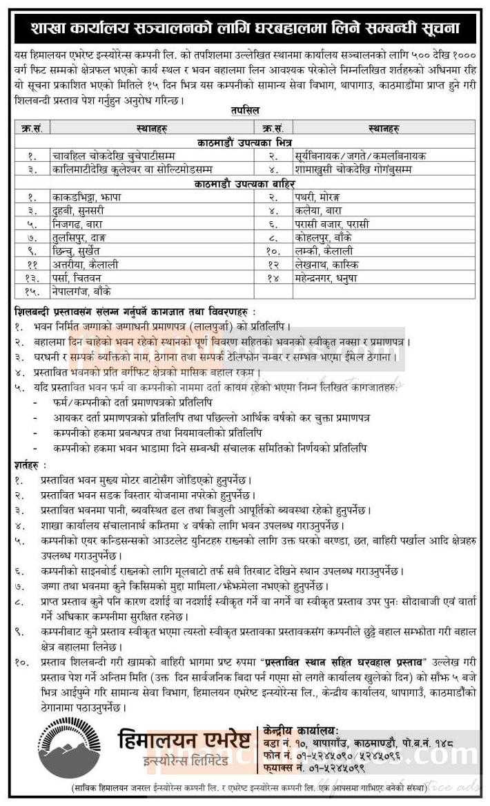 शाखा कार्यालय सञ्चालनको लागि घरबहालमा लिने सम्बन्धी सूचना