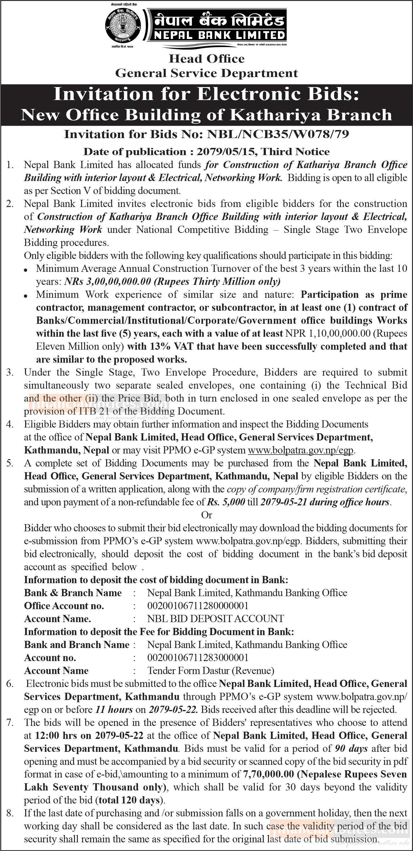 Invitation for Electronic Bids: New Office Building of Kathariya Branch