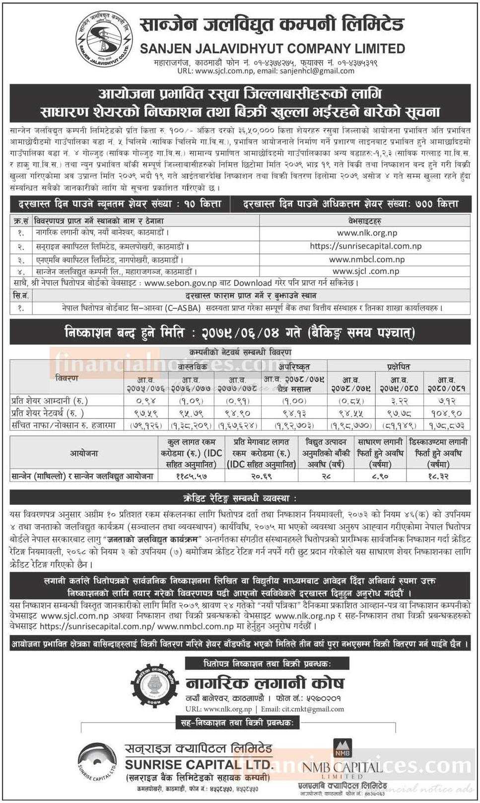 सान्जेन जलविद्युतको IPO मा आवेदन दिने म्याद थप गरिएको सम्बन्धी सूचना