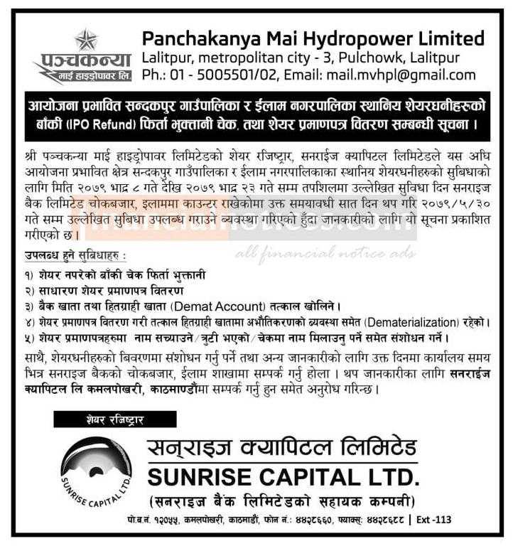 स्थानिय शेयरधनीहरुको बाँकी फिर्ता भुक्तानी चेक तथा शेयर प्रमाणपत्र वितरणबारे सूचना