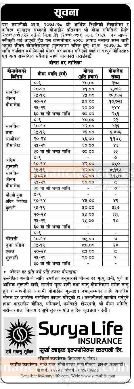 Surya Life Insurance has published a notice regarding a new bonus rate for its different life insura
