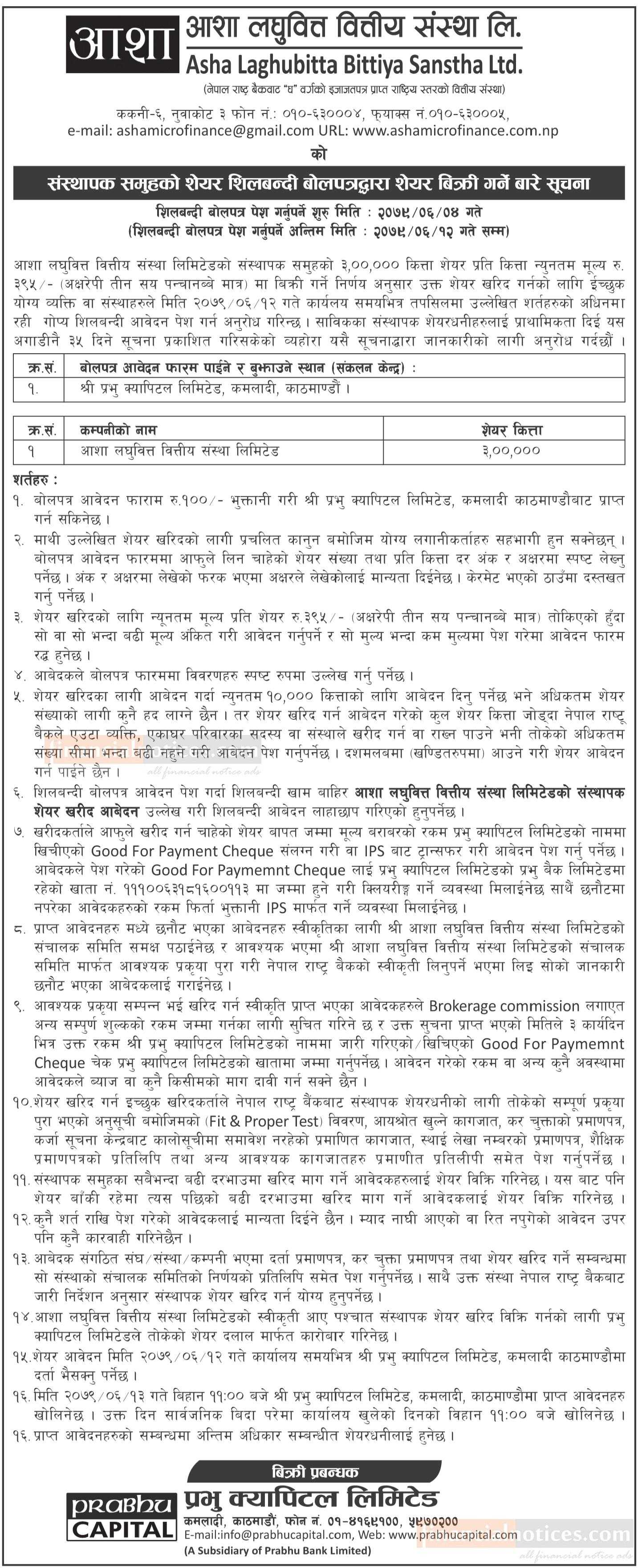 आशा लघुवित्तको संस्थापक समुहको शेयर बोलपत्रद्वारा बिक्री गर्ने सूचना