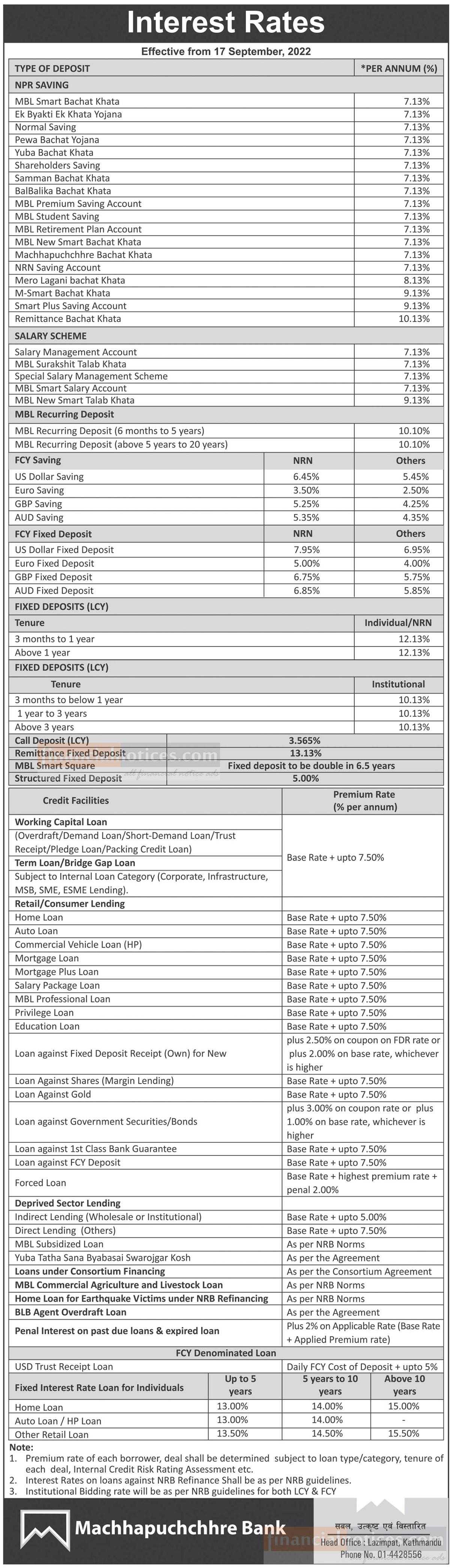 माछापुच्छ्रे बैंकको नयाँ ब्याजदर सार्वजनिक
