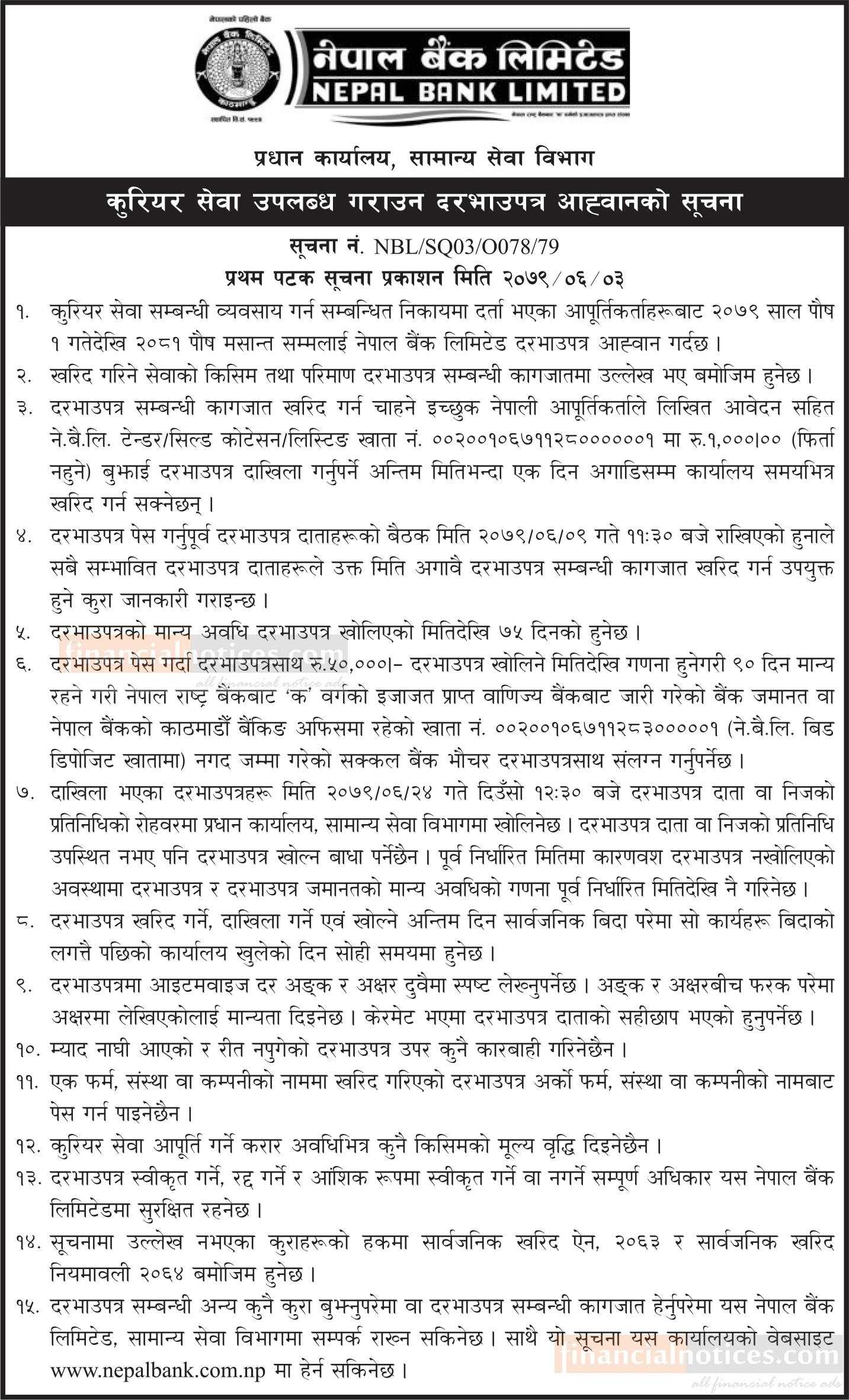 बैंकको लागि कुरियर सेवा उपलब्ध गराउन दरभाउपत्र आह्वान गरिएको सूचना