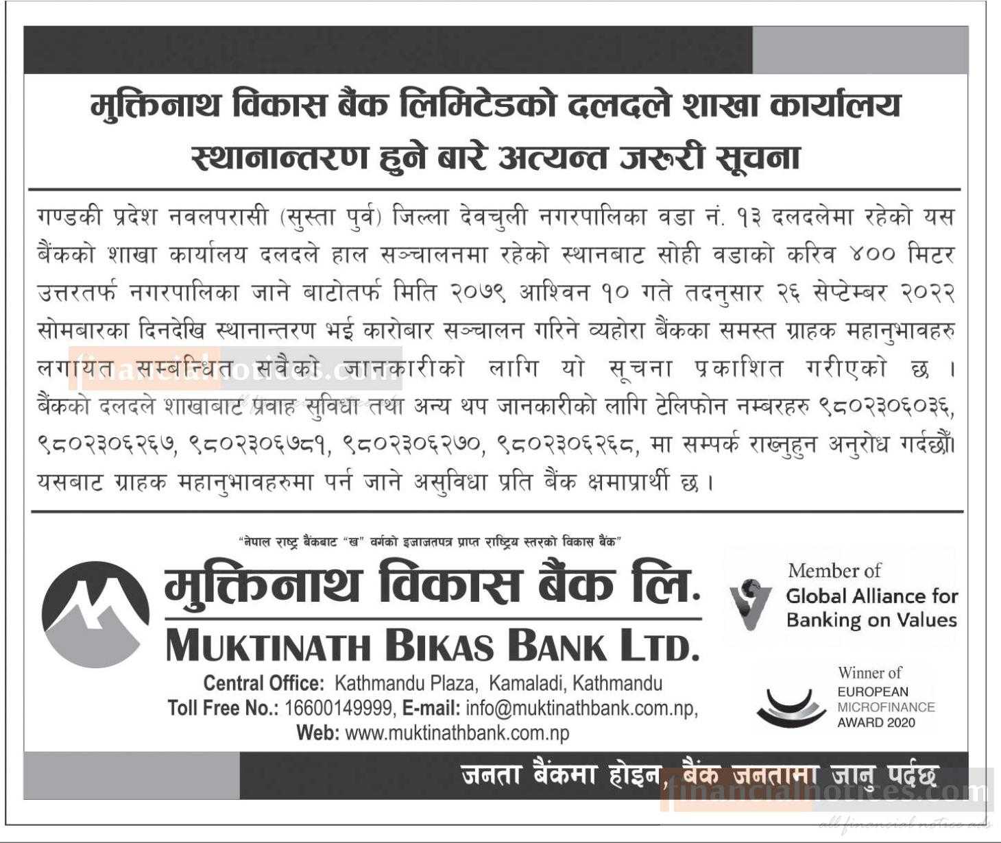 बैंकको शाखा कार्यालय स्थानान्तरण हुने बारे अत्यन्त जरुरी सूचना