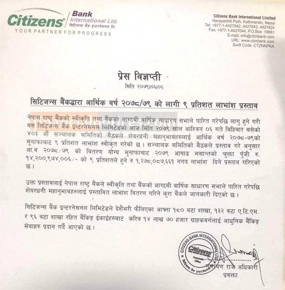 सिटिजन्स बैंकको लाभांश घोषणा बारे सूचना