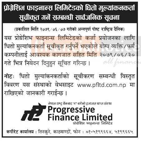 प्रोग्रेशिभ फाइनान्सको धितो मुल्यांकनकर्ता सूचीकृत गर्ने सम्बन्धी सूचना