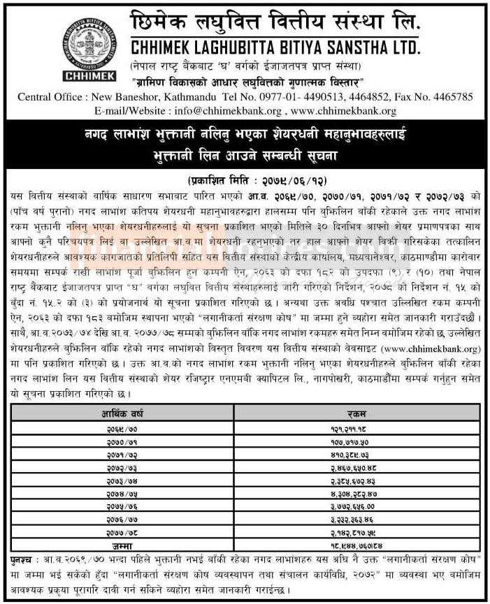 नगद लाभाँस लिन शेयरधनी महानुभावहरुलाई छिमेक लघुवित्तको सूचना