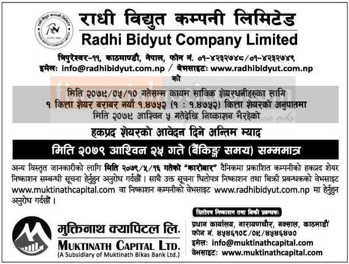 राधि विद्युत कम्पनीको हकप्रद शेयरमा आवेदन दिने अश्विन २५ गते सम्म मात्र