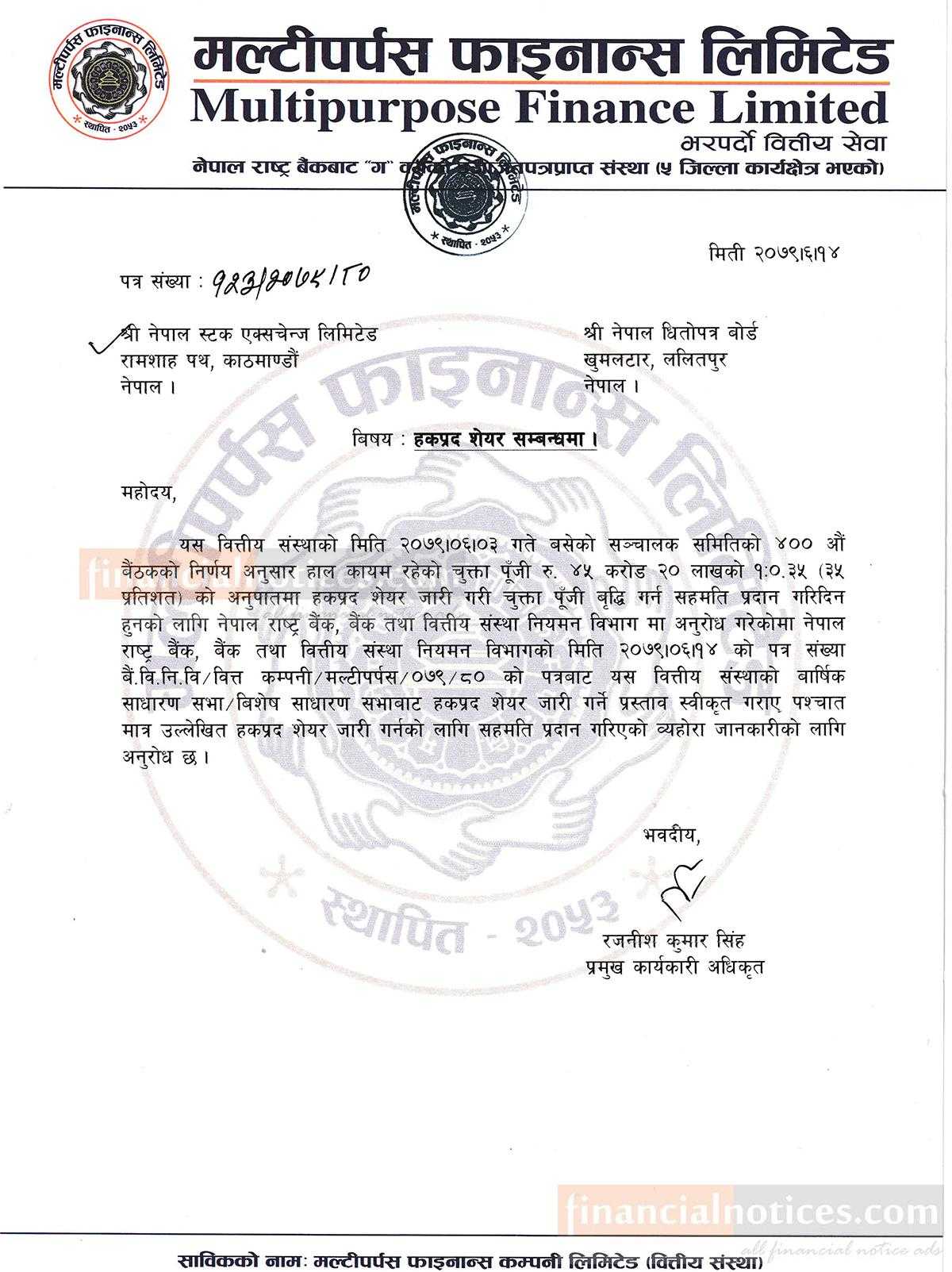 मल्टीपर्पस फाइनान्सले हकप्रद निष्कासन गर्ने, राष्ट्र बैंकबाट पायाे सहमति