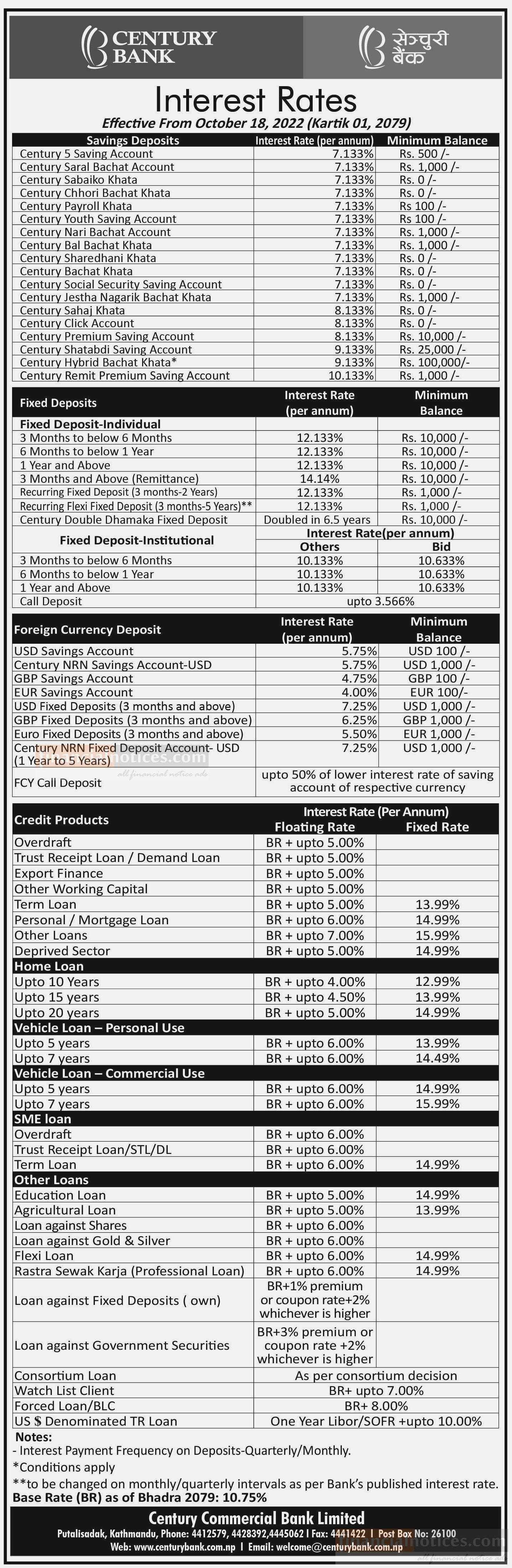 सेन्चुरी कमरसियल बैंकको नयाँ ब्याजदर सार्वजानिक