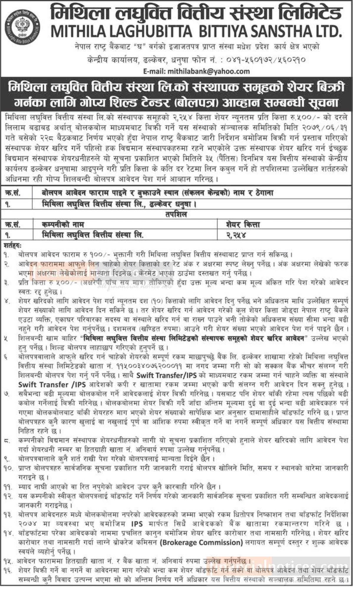 मिथिला लघुवित्तको संस्थापक समूहको शेयर बिक्रीबारे सूचना