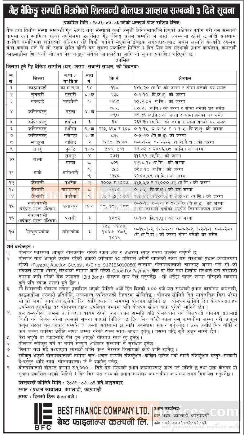 बैंकको विभिन्न शाखा कार्यालयमा धितो सुरक्षणमा रहेको सम्पत्ति लिलाम बिक्रीको सूचना