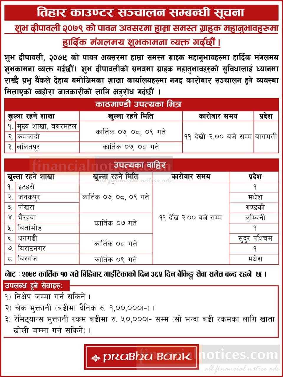 तिहार काउण्टर संचालन सम्बन्धी सूचना