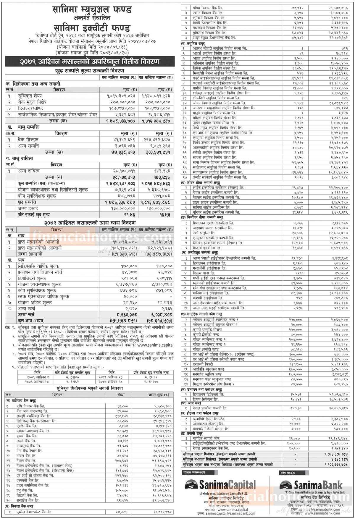 Sanima Capital has published “Sanima Equity Fund” Net Asset Value till Ashwin, 2079