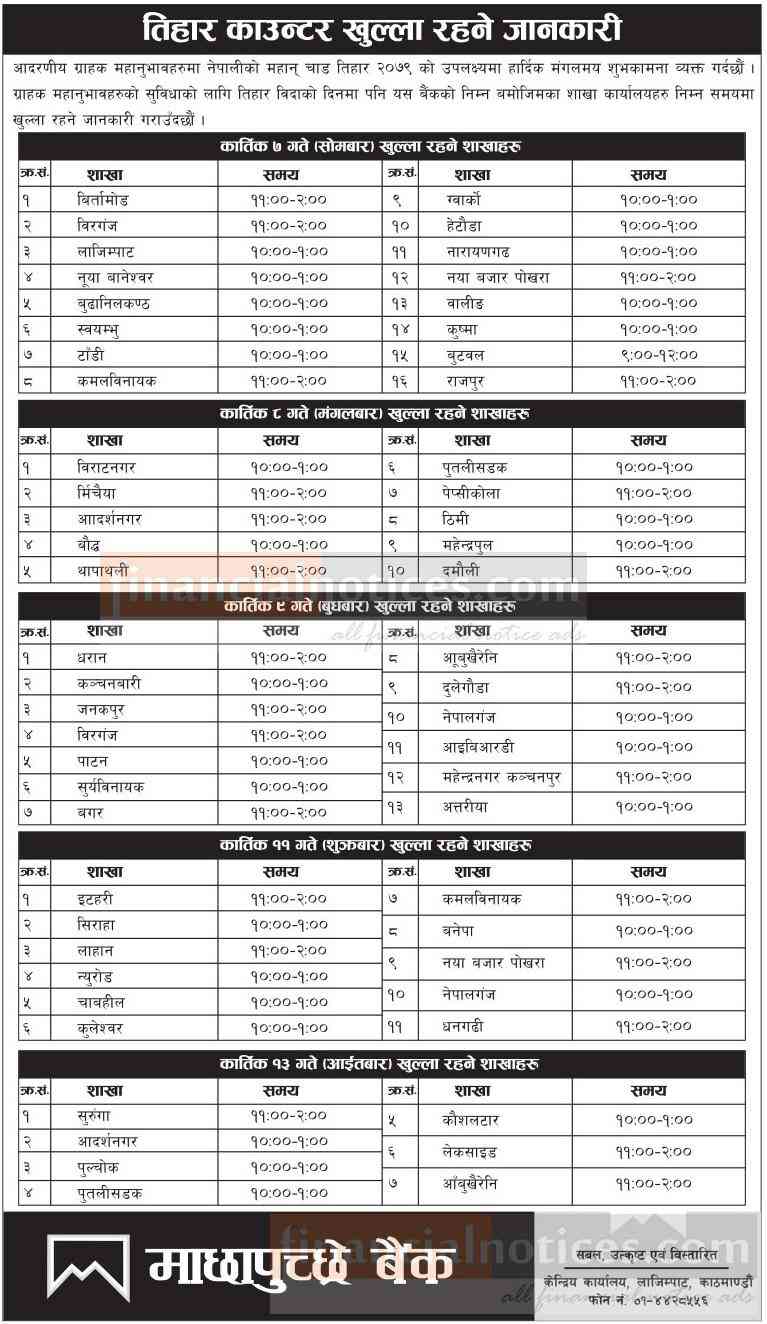 माछापुच्छ्रे बैंकको तिहार काउण्टर खुल्ला रहने सम्बन्धी सूचना