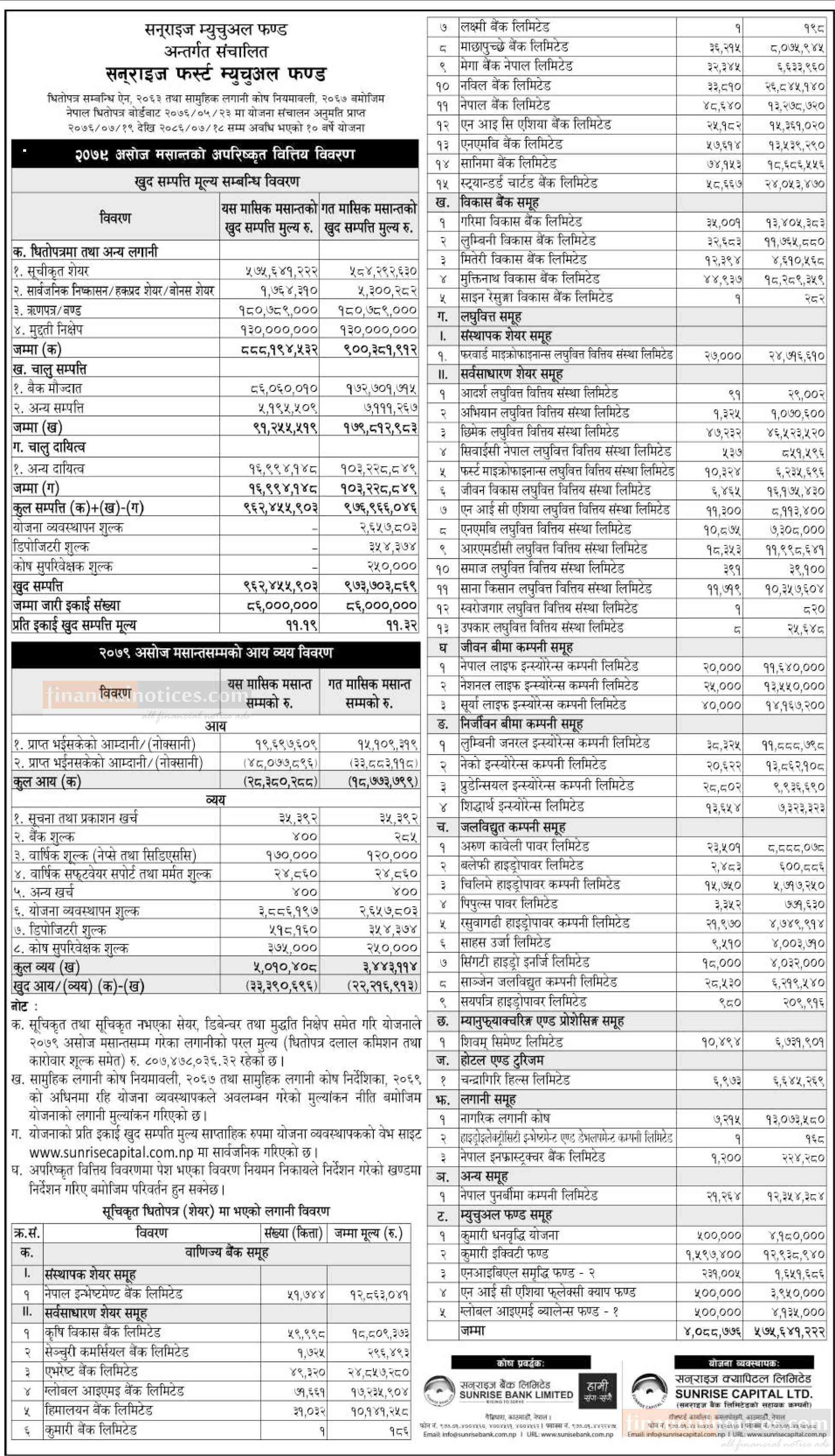 Sunrise Capital has published Sunrise First Mutual Fund NAV up to Ashoj 2079
