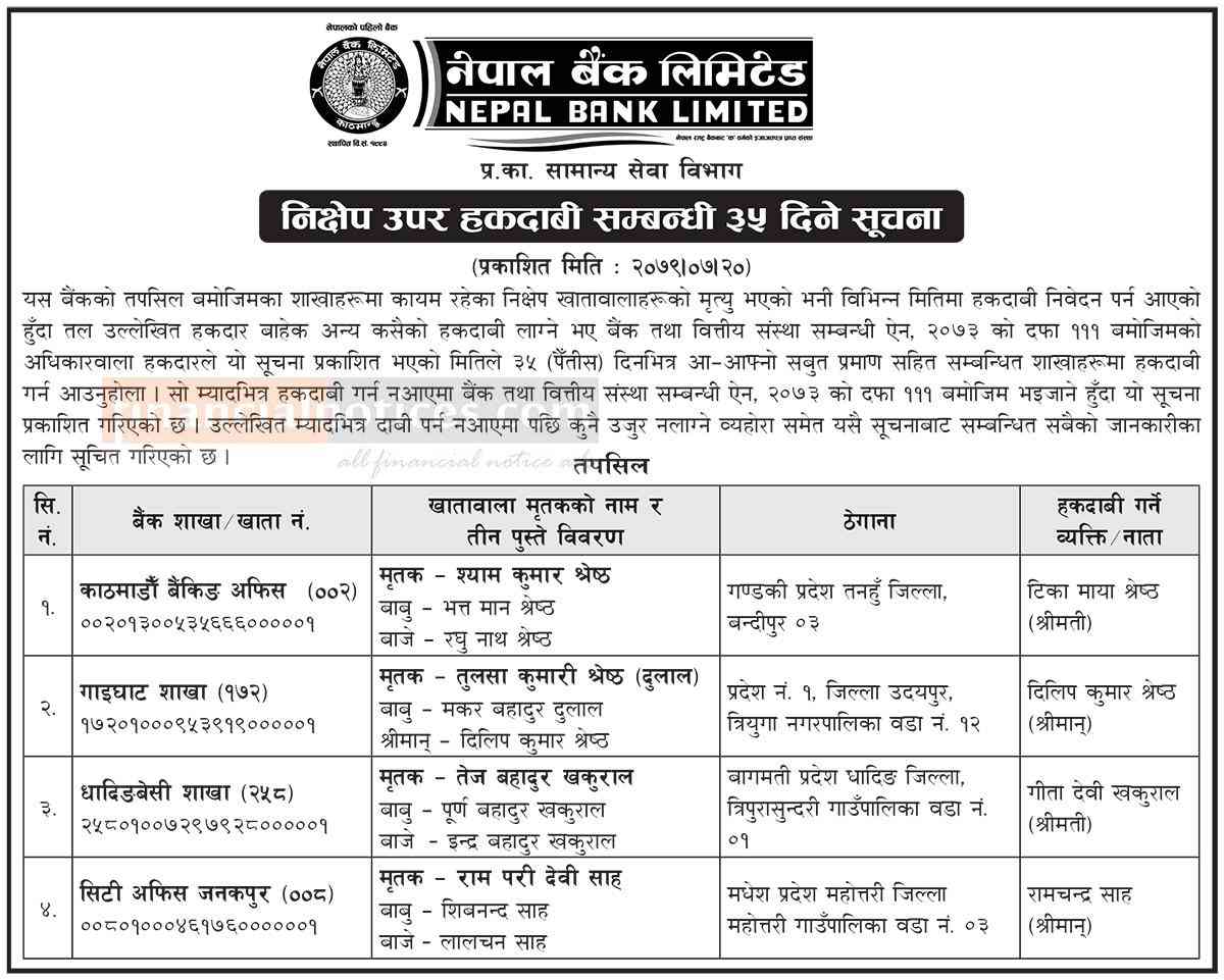 निक्षेप उपर हकदावी सम्बन्धी सूचना
