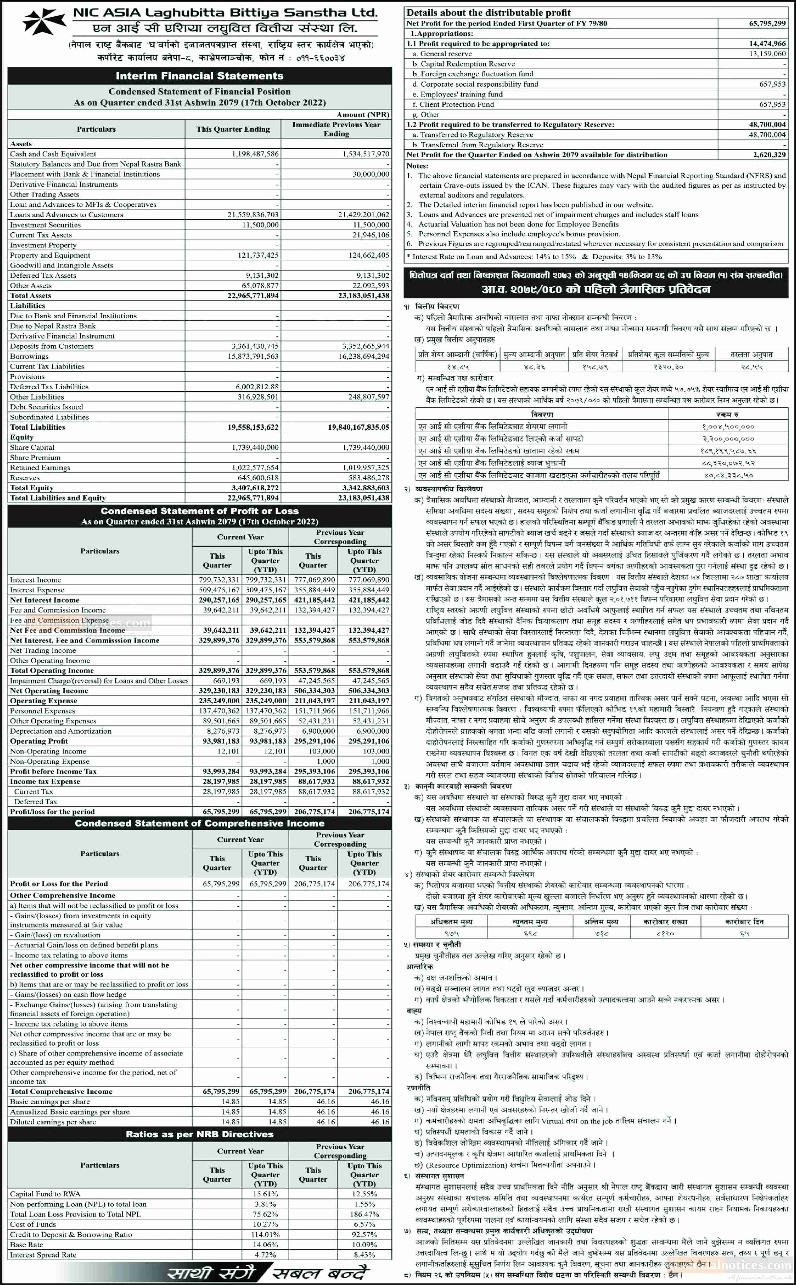 NIC Asia Laghubitta has posted a net profit of Rs 65.79 million during its 1st quarter.
