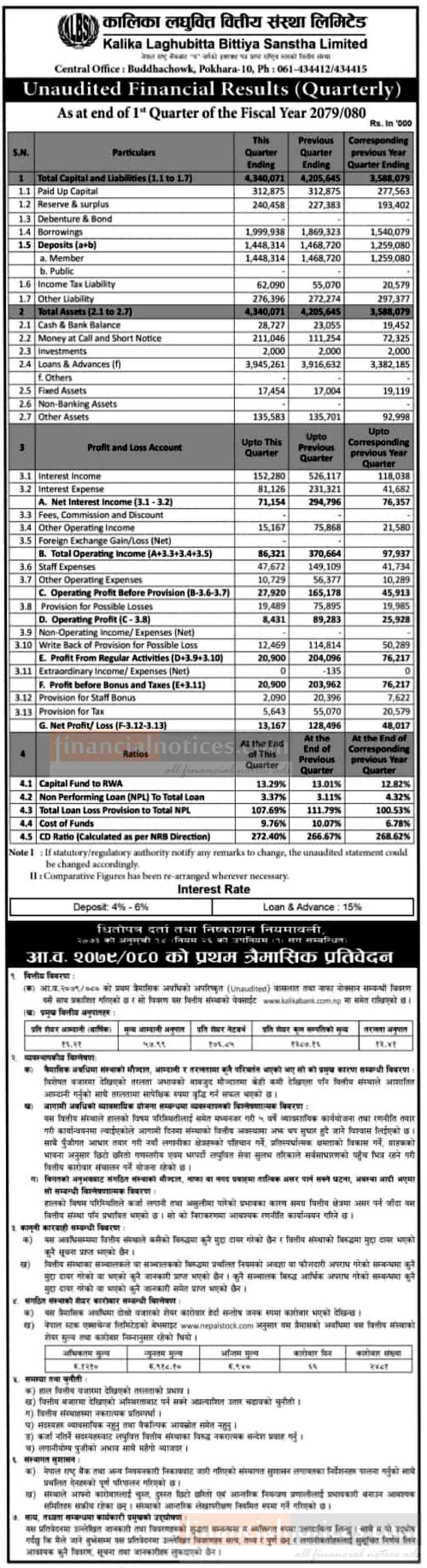 Kalika Laghubitta has posted a net profit of Rs 13.16 million during its 1st quarter.