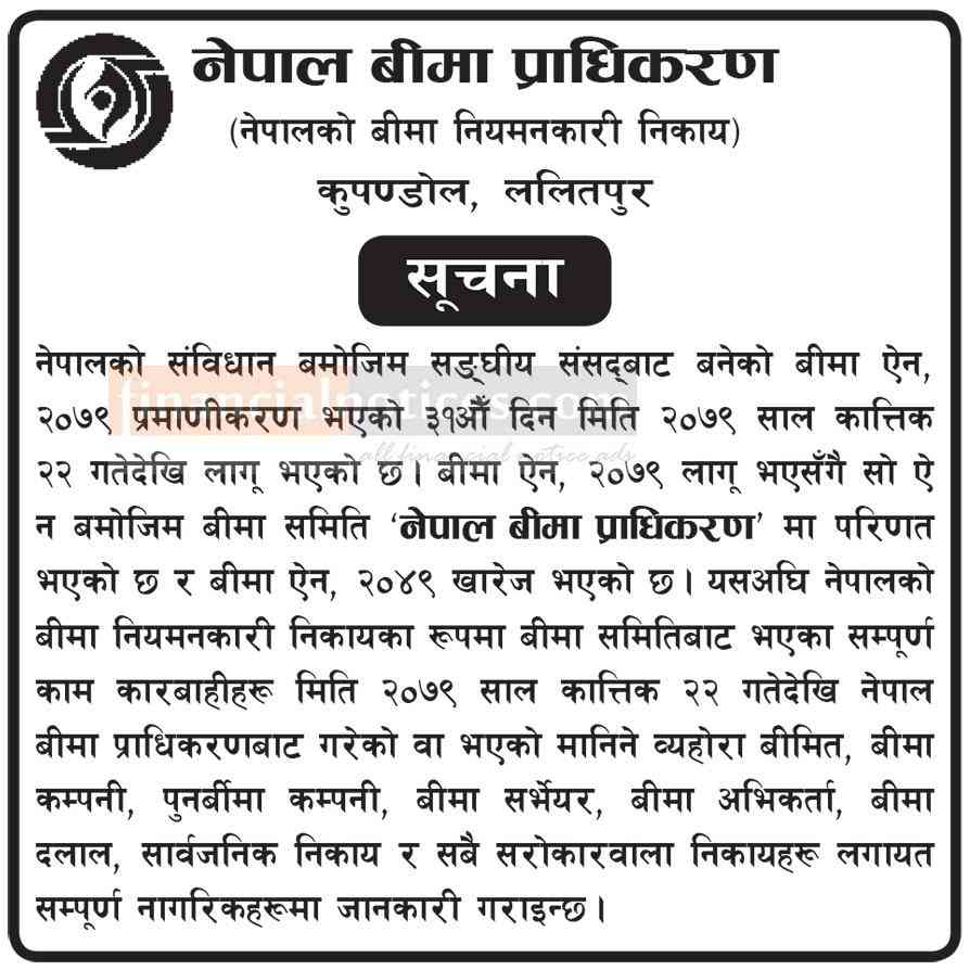 बीमा समितिको नाम परिवर्तन भई नेपाल बीमा प्रधिकरण भएको बारे सूचना