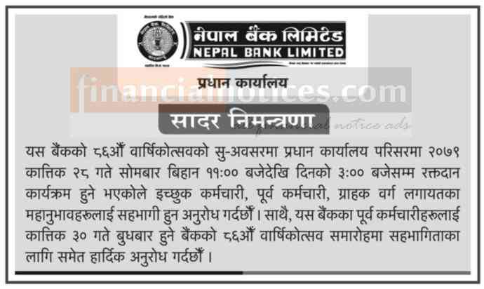 नेपाल बैंकको ८६ औँ वार्षिकोत्सवको अवसरमा सहभागिताका लागि सादर निमन्त्रणाबारे सूचना