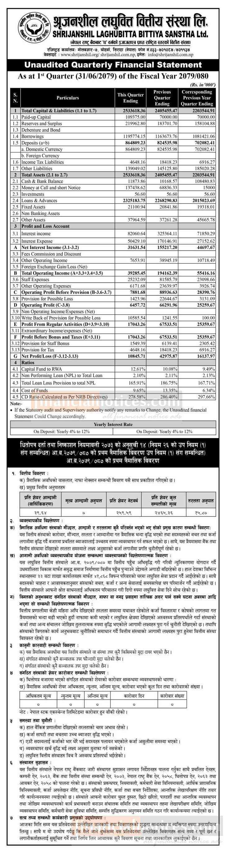 Shrijanshil Laghubitta has posted a net profit of Rs 10.84 million during its 1st quarter.