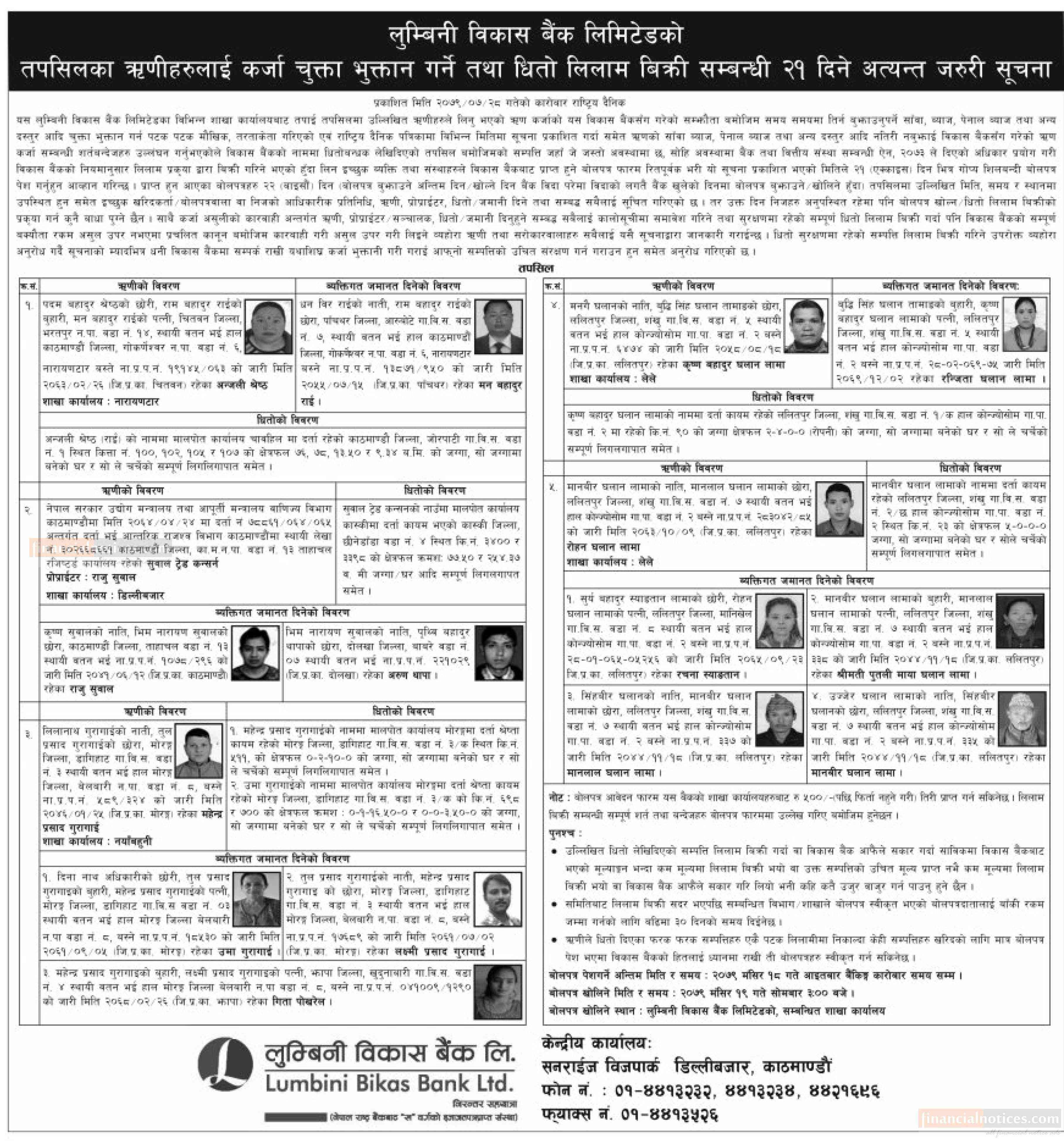 लुम्बिनी विकास बैंकका ऋणीहरुलाई कर्जा चुक्ता भुक्तान गर्ने तथा धिता लिलाम बिक्रीको सूचना