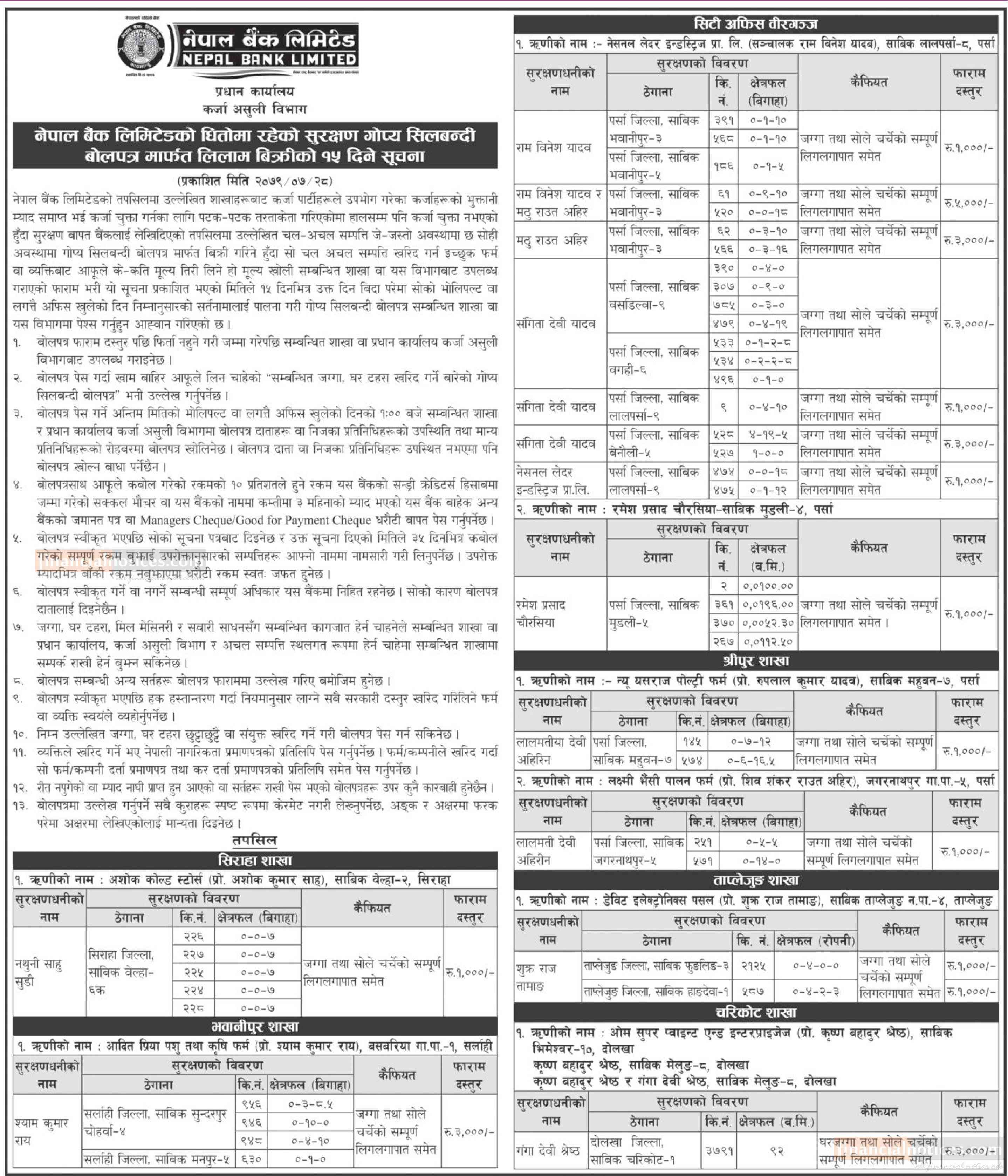 नेपाल बैंकको धितोमा रहेको सुरक्षण गोप्य सिलबन्दी बोलपत्र मार्फत लिलाम बिक्रीको सूचना