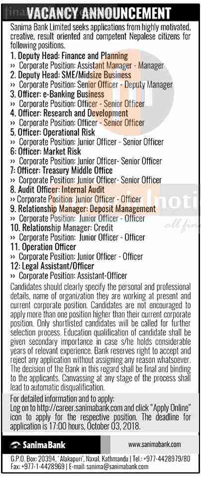 सानिमा बैंकमा जागिर खुल्यो