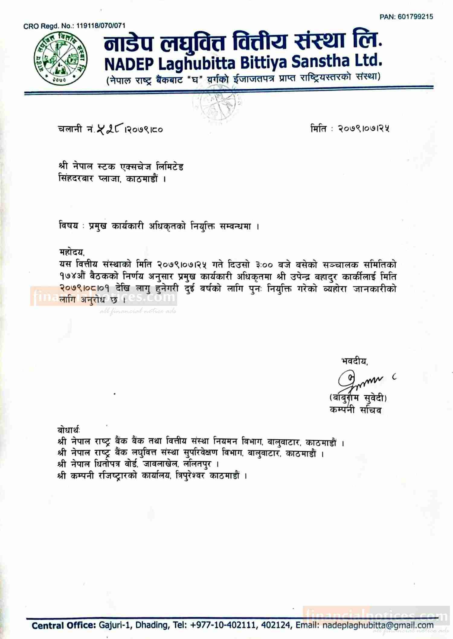 CEO Re-Appointment of Nadep Laghubitta