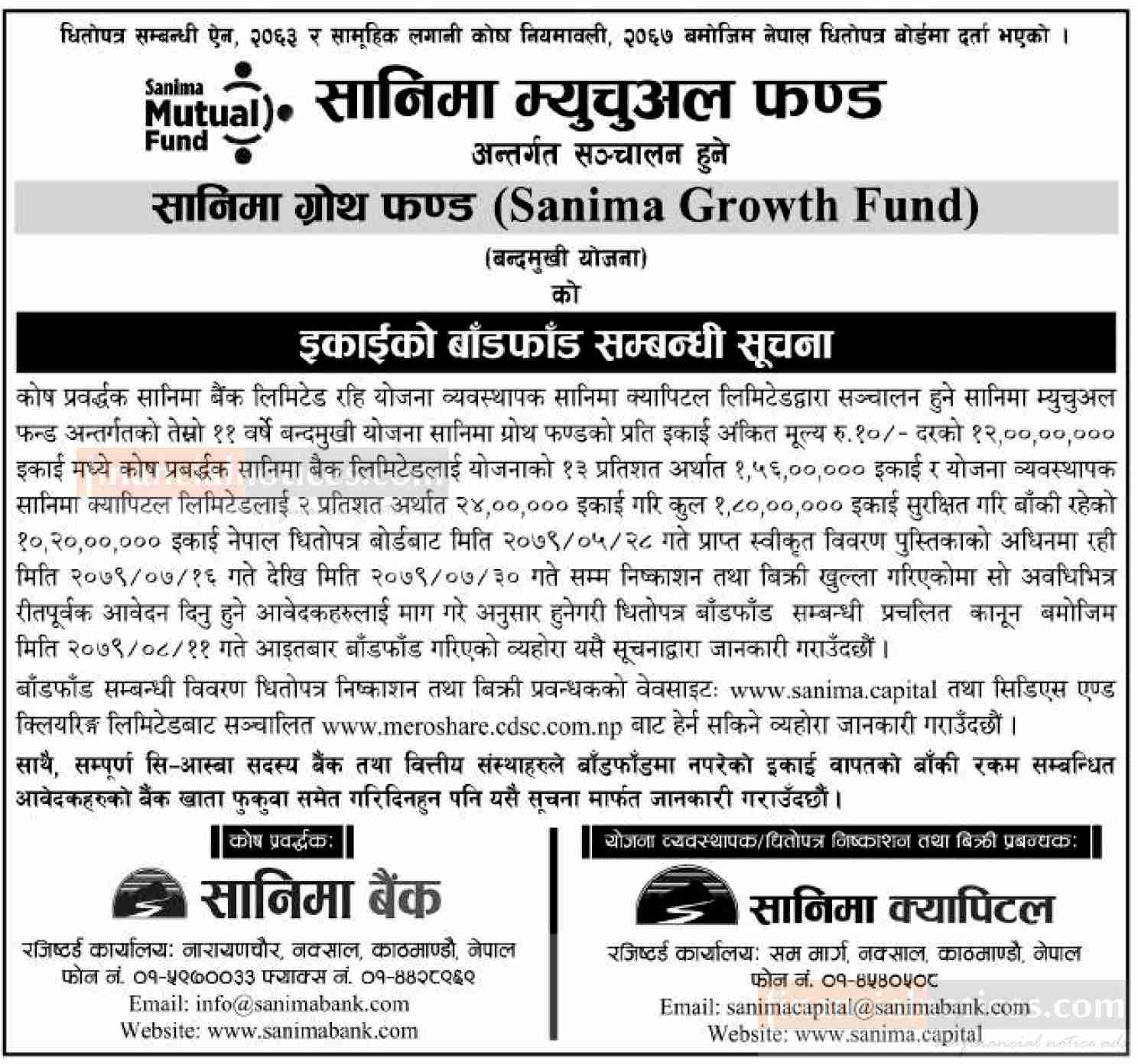 Sanima Mutual Fund अन्तर्गत सञ्चालन हुने सानिमा ग्रोथ फण्डको इकाईको बाँडफाँड सम्बन्धी सूचना