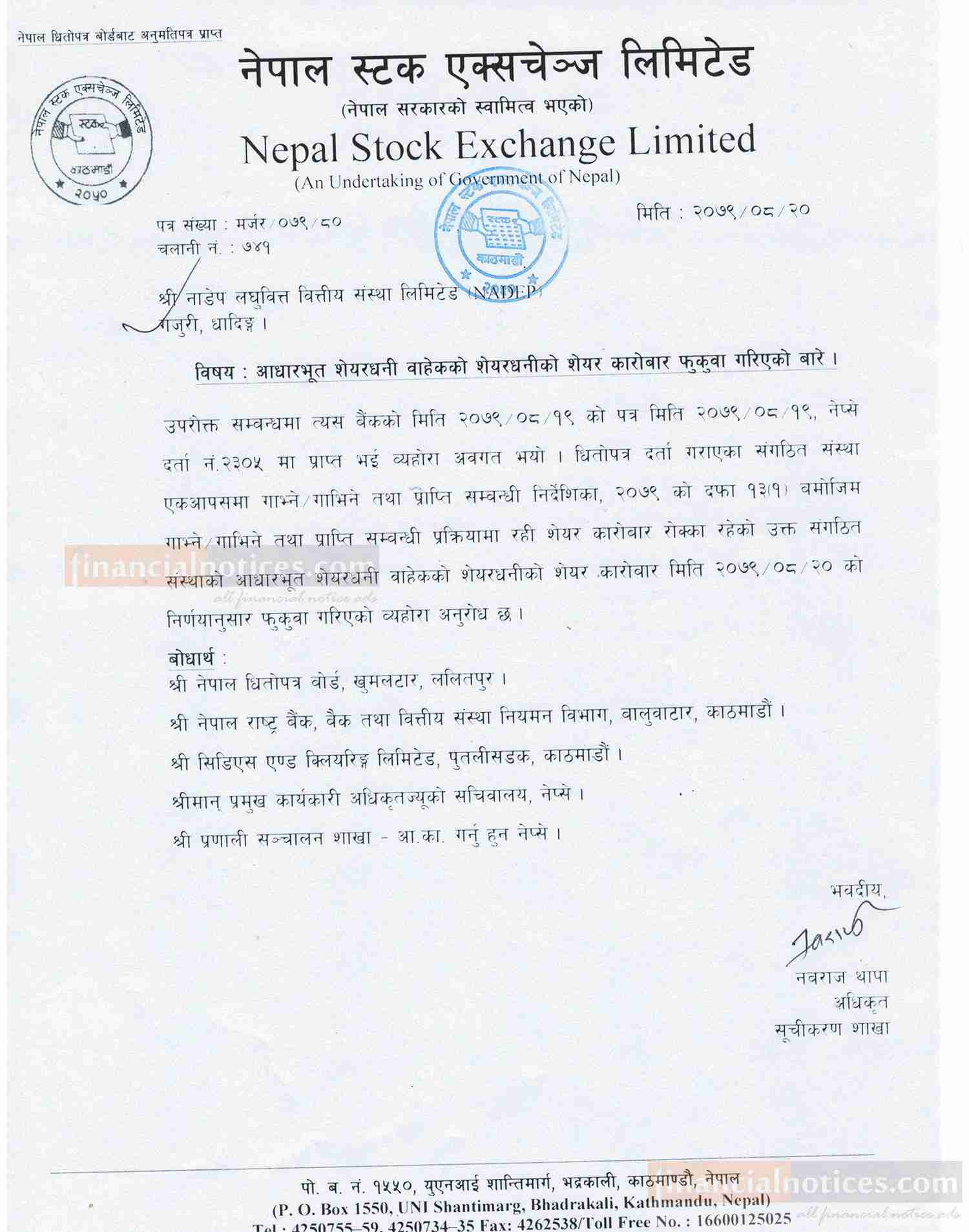 नाडेप लघुवित्तको शेयर कारोबार फुकुवा गरिएको बारे सूचना