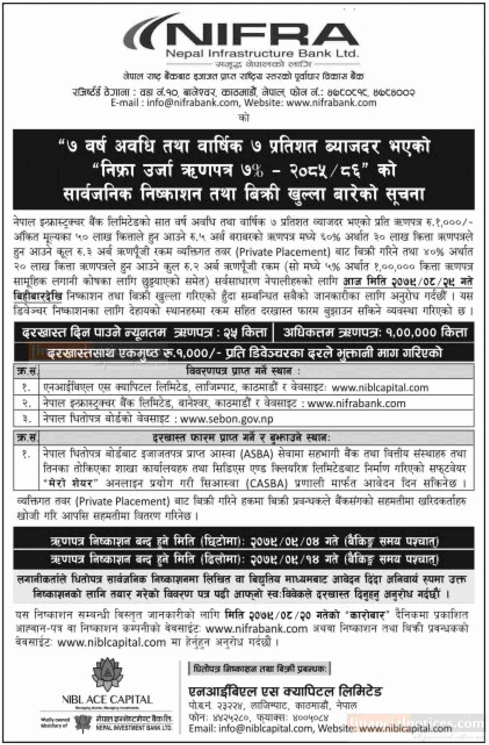 निफ्राको ऋणपत्रमा आजदेखि आवेदन खुल्ला भएको बारे सूचना
