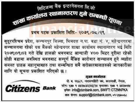 शाखा कार्यालय स्थानान्तरण हुने सम्बन्धी सूचना