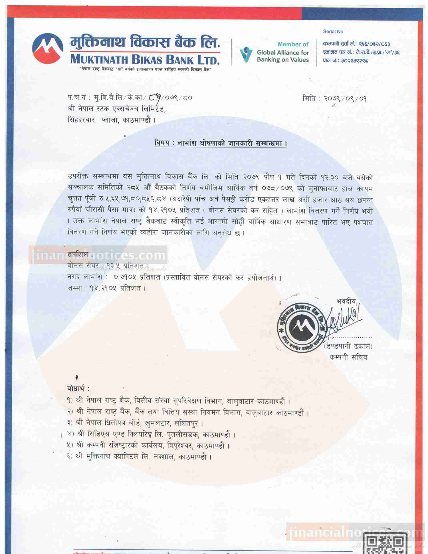 मुक्तिनाथ विकास बैंकको १४.२१ प्रतिशत लाभांश घोषणा सम्बन्धी सूचना
