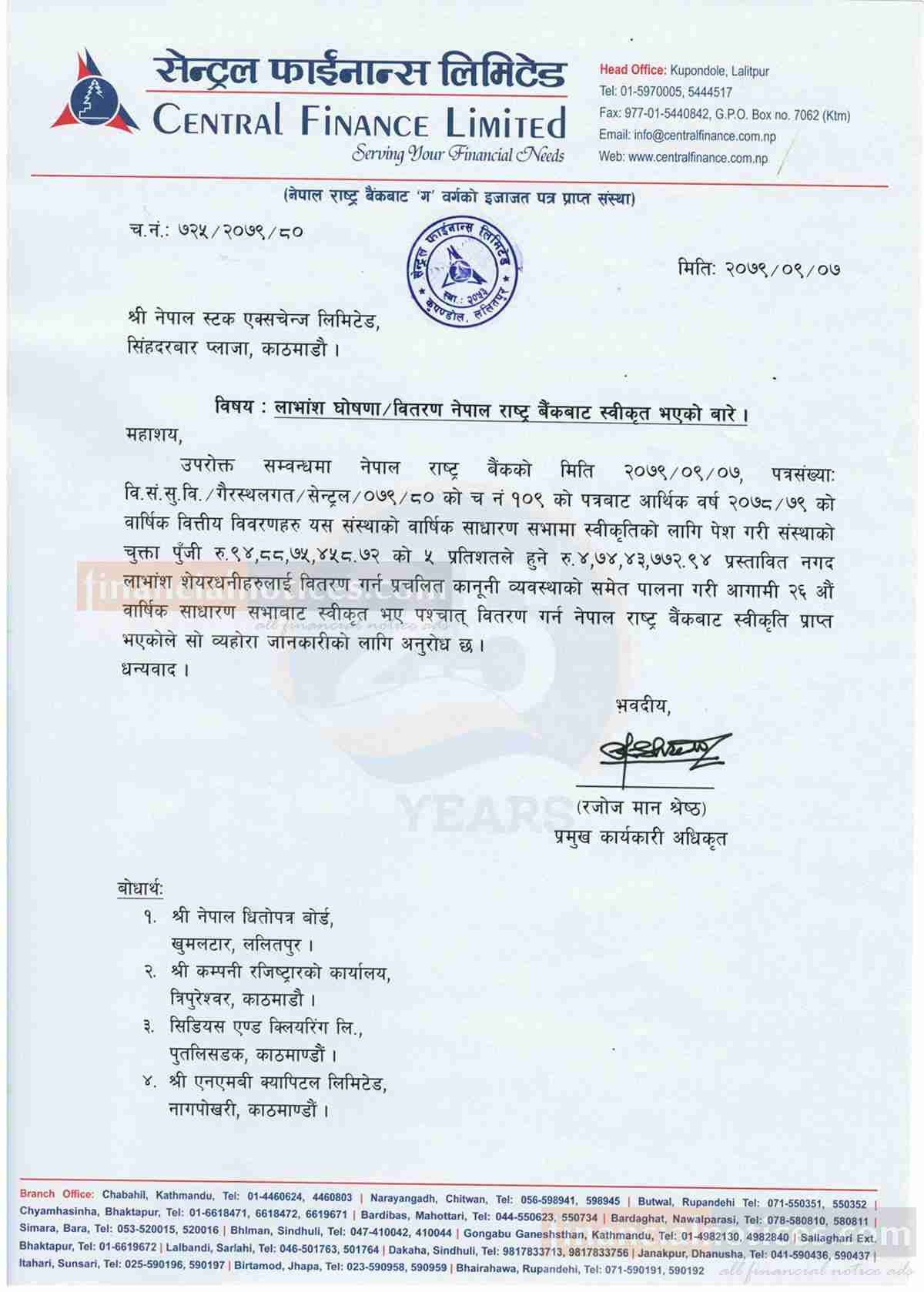 सेन्ट्रल फाइनान्सको लाभांस राष्ट्र बैंकबाट स्वीकृत भएको बारे सूचना