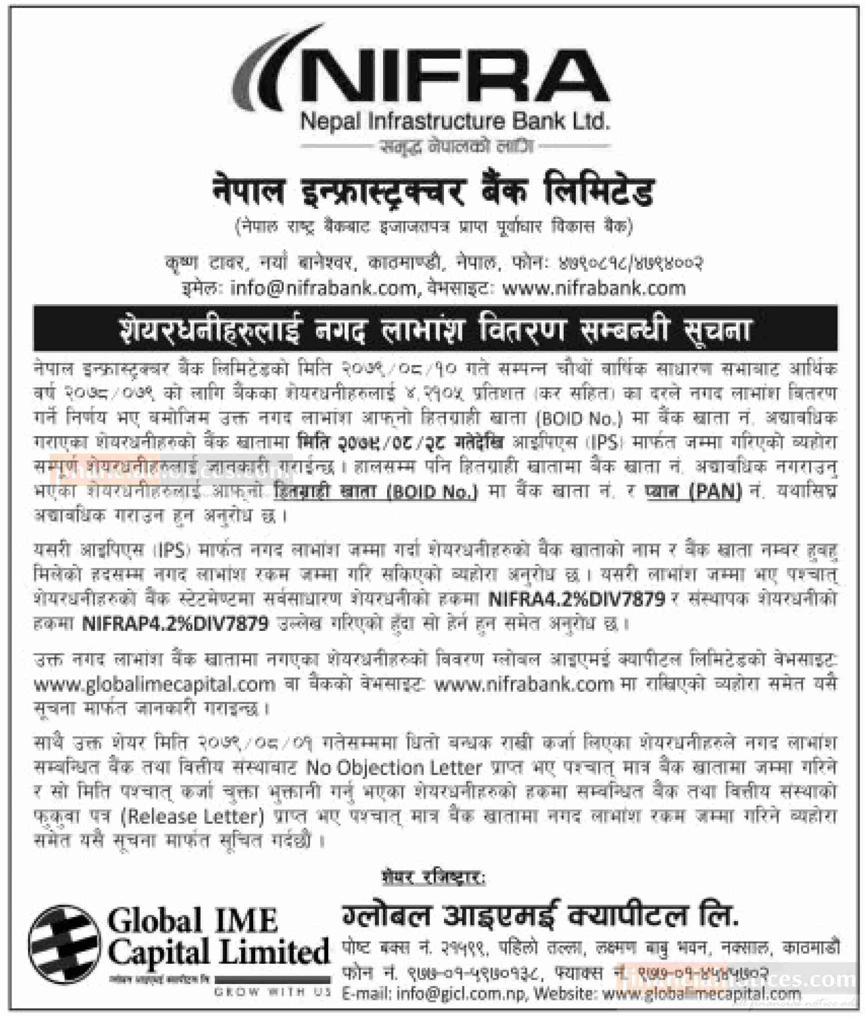 निफ्राको शेयरधनीहरुलाई नगद लाभांस वितरण सम्बन्धी सूचना
