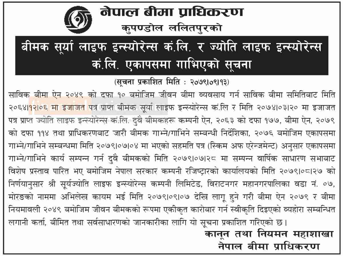 सुर्या लाईफ र ज्योति लाईफ इन्स्योरेन्स एक आपसमा गाभिएको बारे सूचना