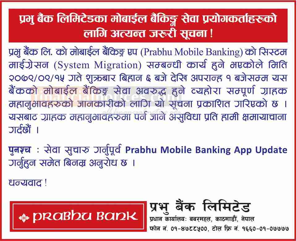 प्रभु बैंकको मोबाइल बैकिङ्ग प्रयोगकर्ताहरुको लागि जरुरी सूचना