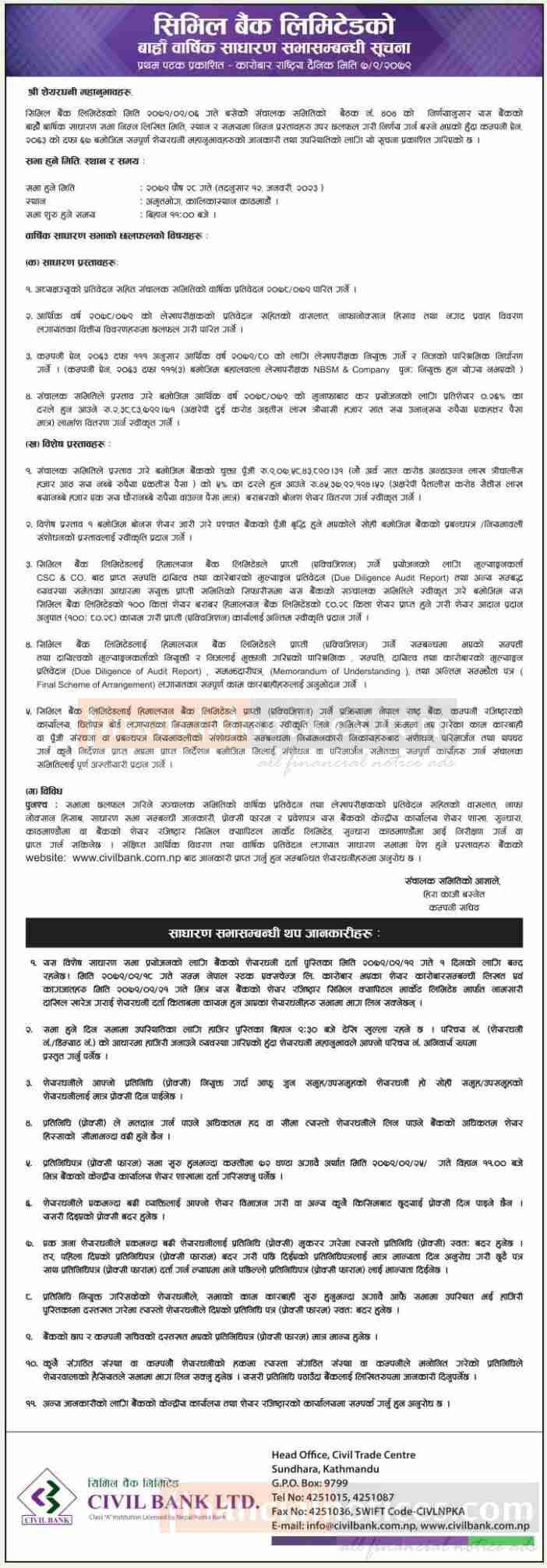 सिभिल बैंकको बाह्रौं वार्षिक साधारण सभा सम्बन्धी सूचना