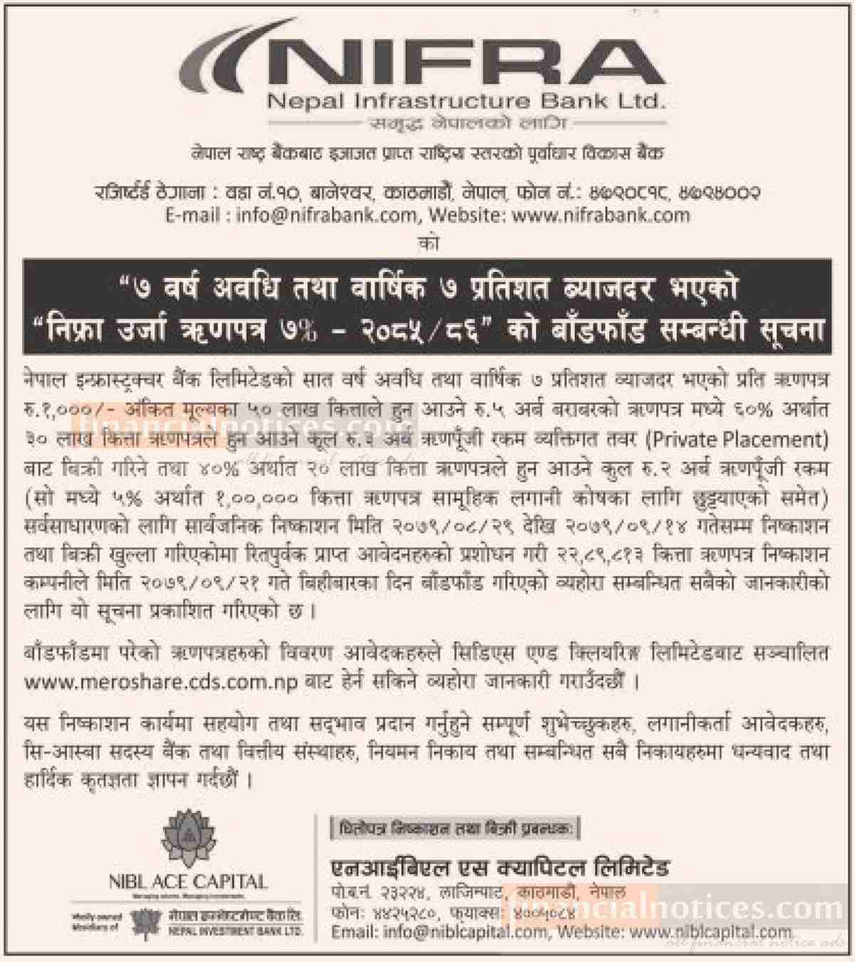नेपाल इन्फ्रास्ट्रक्चर बैंकका ऋणपत्र बाँडफाँड सम्बन्धी सूचना